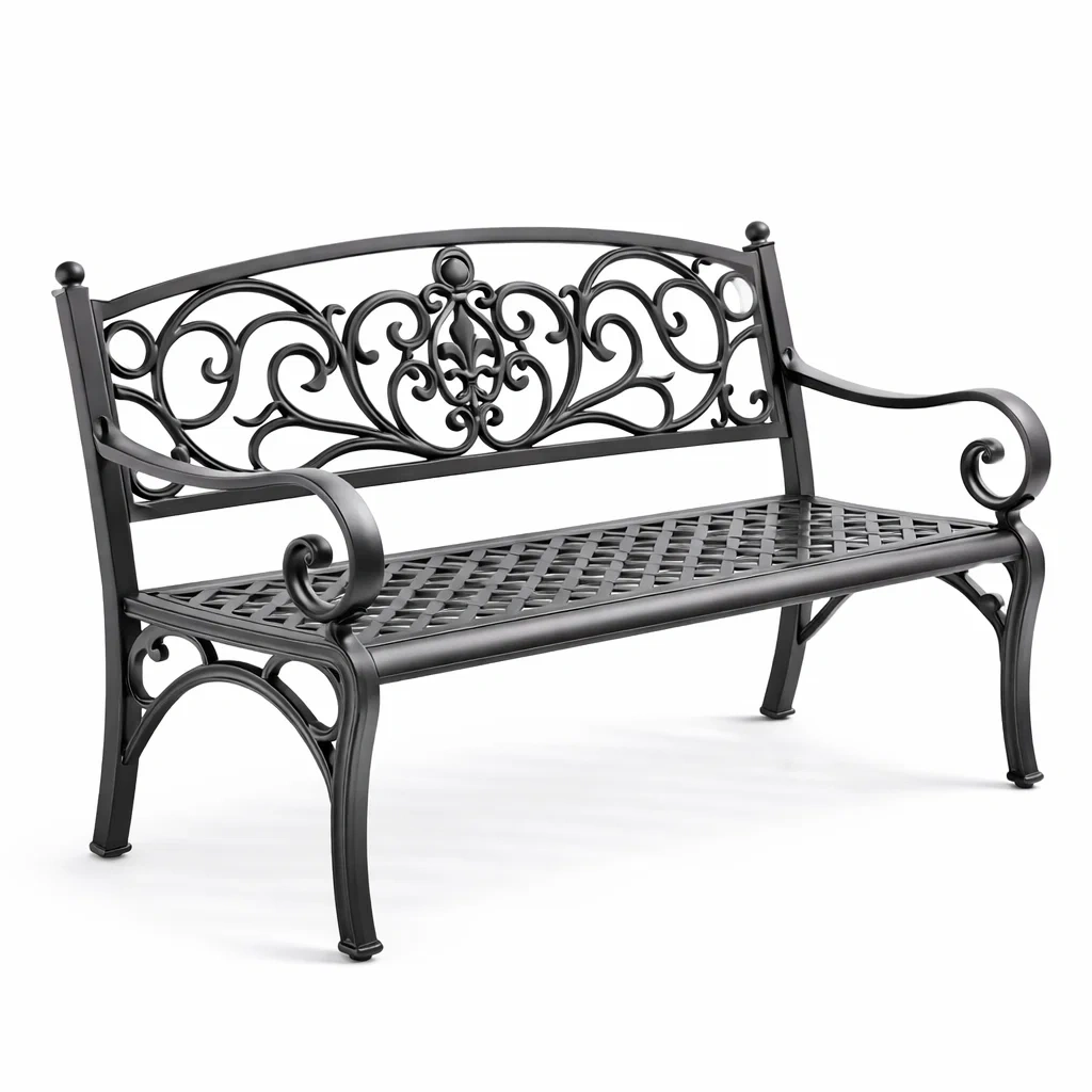 Ce banc de jardin est fabriqué en fer forgé, offrant une structure robuste et durable.