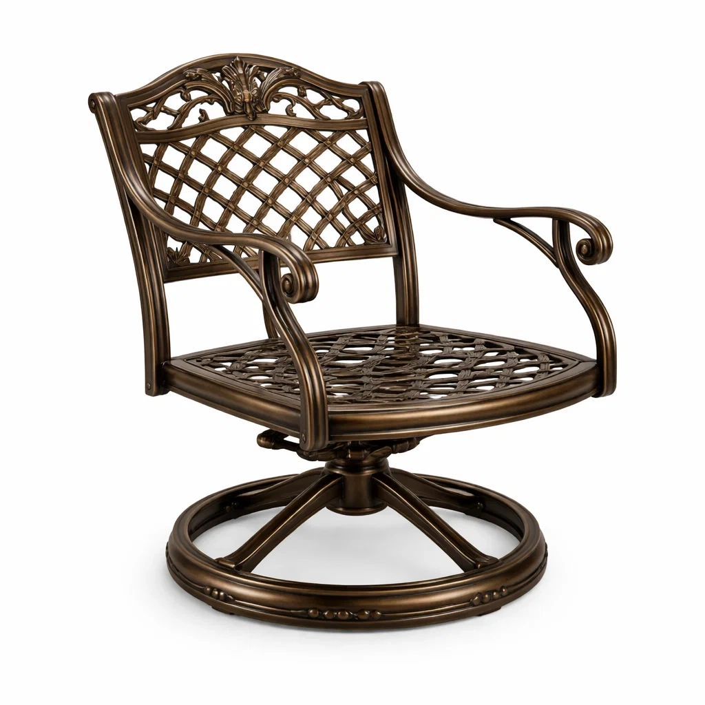 Cette chaise de jardin est fabriquée en aluminium avec une finition de surface en revêtement bronze. Elle est dotée d'un dossier et d'une assise ajourés, et elle offre une fonctionnalité pivotante. Capacité de charge : 120 kg.
