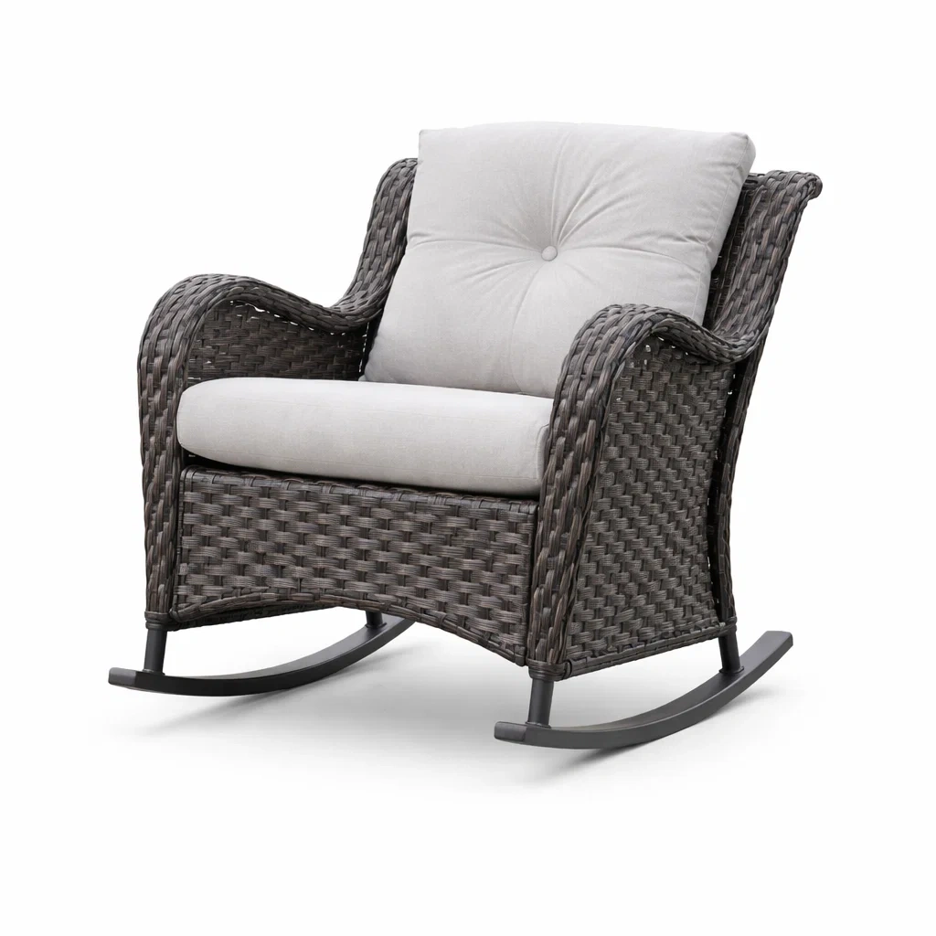 Fauteuil à bascule en résine tressée avec coussins gris clair