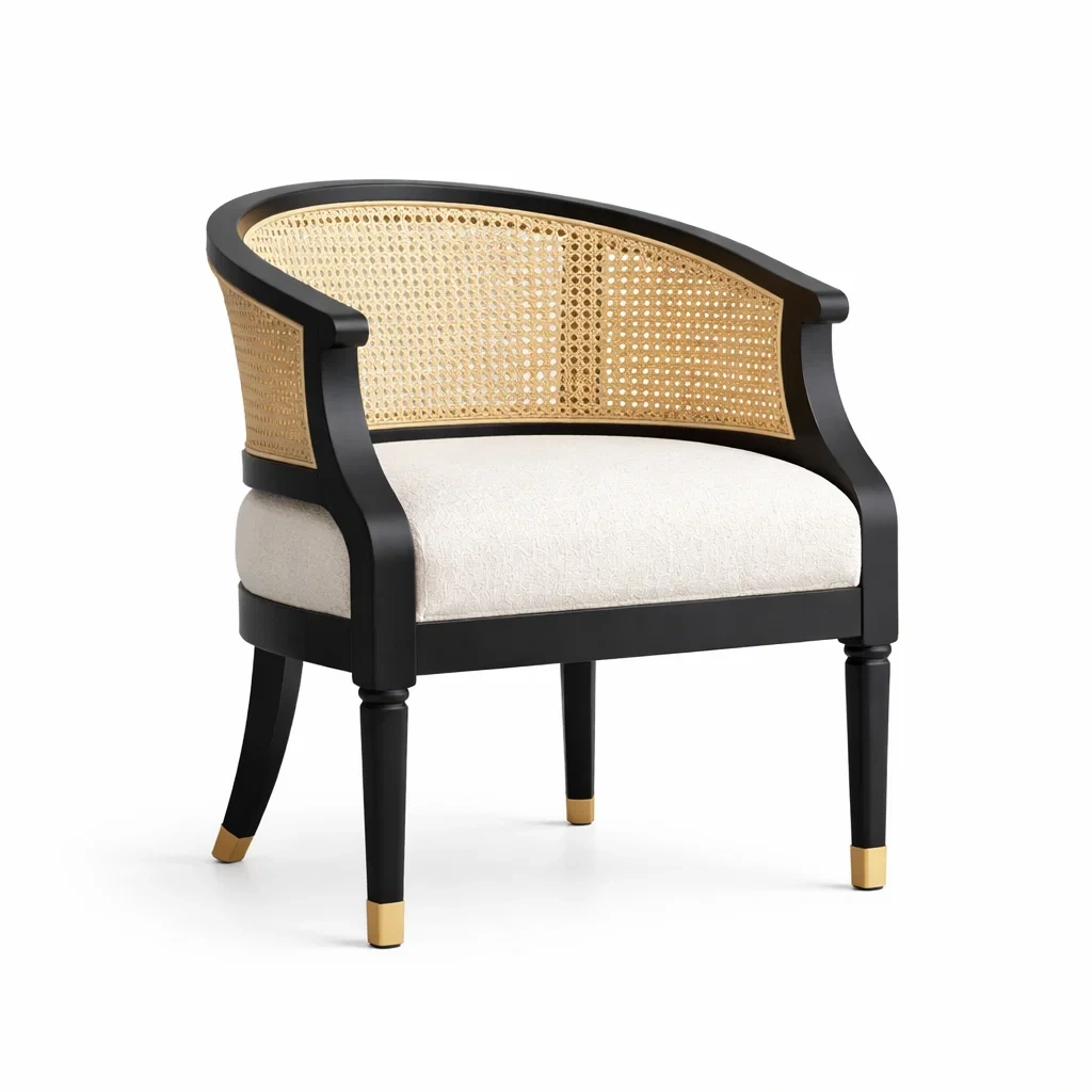 Matériau : Cadre en bois massif, dossier en rotin, assise en mousse de polyuréthane avec revêtement en tissu polyester.