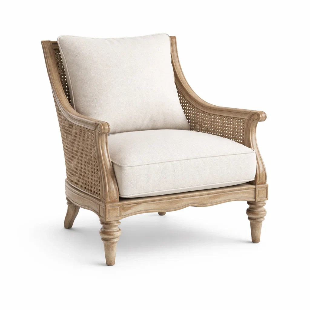Matériau : Structure en bois avec dossier en rotin tissé, revêtement en lin.