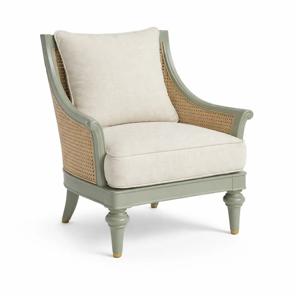 Fauteuil avec structure en bois robuste et côtés en rotin tissé. Le coussin est en tissu de polyester et de lin, offrant un soutien confortable.